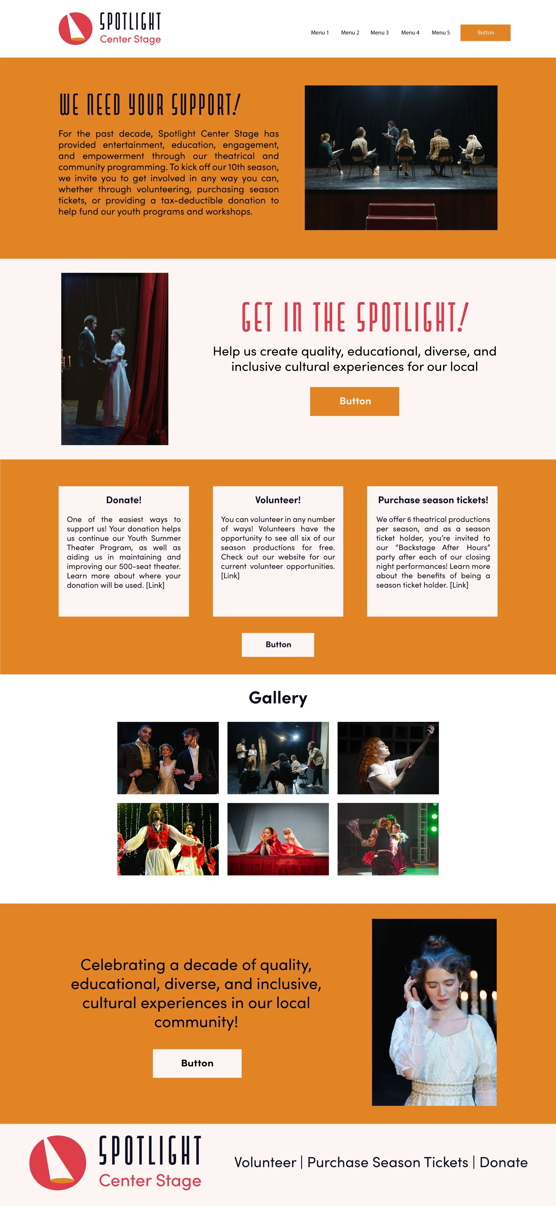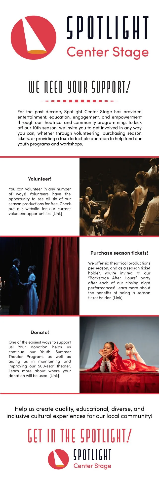 Spotlight Center Stage needed a multi-channel advertising campaign raise interest in the theater community in terms of volunteers, donations, and season ticket purchases. It required a display ad, social media ad, email blast, and website homepage design. All branding and visual assets were provided, although I did use Photoshop to adjust lighting/tone for the imagery. I really liked the man and woman with curtain image and centered my ideas around that, using the curtain as “empty” space for text. All deliverables created in InDesign.